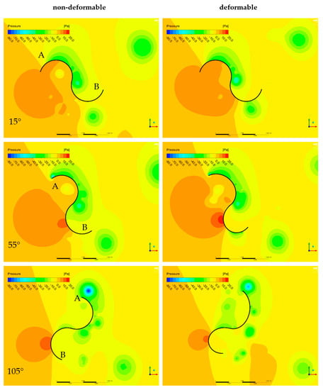 Pressure fields for selected instants (15°, 55° and 105°) of one revolution of the rotors with non-deformable and deformable blades.