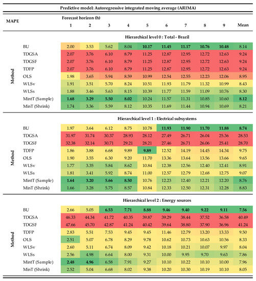 Hierarchical forecasting for electricity generation based on the ARIMA procedure (MAPE). (Note: The performance was indicated into a color scale, where green means better values for calculated accuracy, and red means worse accuracy. The intermediate values are colored yellow.).