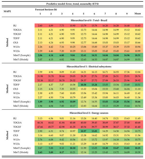 Hierarchical forecasting for electricity generation based on the ETS procedure. (Note: The performance was indicated into a color scale, where green means better values for calculated accuracy, and red means worse accuracy. The intermediate values are colored yellow.).