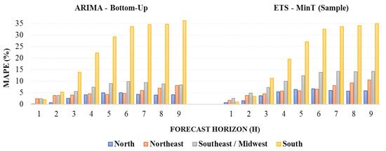 Specifically, in studies of hierarchical time series, the MAPE indicator appears the most frequently in the literature [41,42,43]. MAPE was also the selected metric for the present paper (Figure 2 and Figure 3). Complementarily, MAE, MASE, and RMSE were estimated, and the results can be found in the Appendix A (Figure A3 and Figure A4). The values of the MAPE, MAE, MASE and RMSE statistics were obtained using a weighted average, with proportions from Table 1.