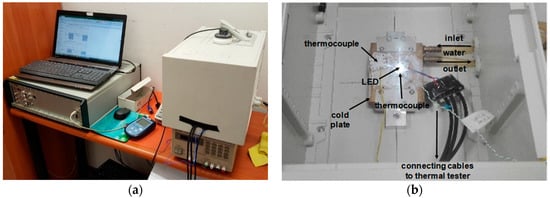 (a) View of the measurement equipment; (b) the interior of the light-tight chamber with the cold plate and a power LED [].