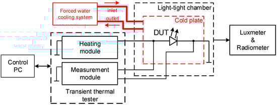 This Section describes the measurement method and the set-up used to obtain characteristics of the tested diodes illustrating an influence of the operating conditions on electric, optical and thermal properties of these devices. All the considered parameters are measured simultaneously with the use of the set-up described below. A view of the considered set-up is shown in Figure 1a. This set-up consists of a transient thermal tester, a water-cooling system with a cold plate, a light-tight chamber, a luxmeter, and a radiometer. The interior of the light-tight chamber with the cold plate are shown in Figure 1b []. The cold plate with a tested power LED is placed inside the light-tight chamber. The thermocouple is used to measure the temperature of the cold plate. The block diagram showing the main components of the measurement system is presented in Figure 2.