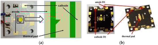 (a) View of the metal core printed circuit board (MCPCB) with the XPLAWT LED and the view of this LED electrode layout for this LED; (b) view of the MCE LED soldered to the MCPCB and the layout of this MCPCB.