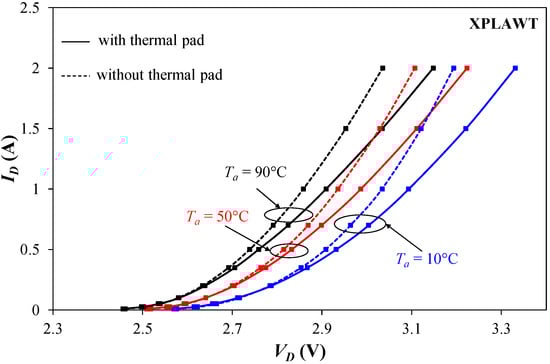 Figure 4 presents the non-isothermal current voltage characteristics of the XPLAWT diodes obtained at selected values of temperature of the cold plate Ta, which is equal to temperature of the MCPCB. As it is visible in the figure, an increase in temperature Ta shifts the characteristics to the left. This effect is observed as a result of self-heating, which is more visible for the diode operating without the thermal pad. In this case the increase in the diode internal temperature over the cold plate temperature is higher. For both manners of assembly, the differences in the junction temperature and the forward voltage drop increase with current. On the other hand, an increase in junction temperature at a constant value of forward voltage causes approximately exponential increase of the forward current.