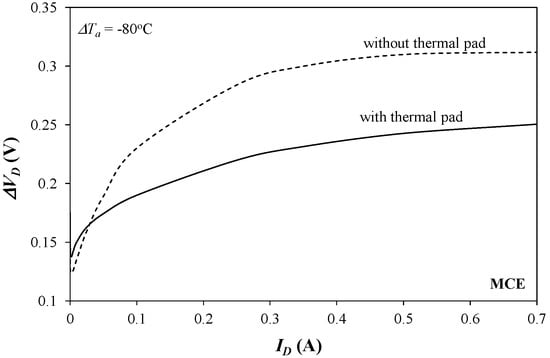 Figure 5 presents for different forward current values the measured diode voltage change ΔVD in response to the variation of the cold plate temperature from 90 °C to 10 °C (ΔTa = −80 °C) in the case of MCE diodes operating with the thermal pad and without it. The value of ΔVD was obtained as the difference of values of forward voltage of the tested LEDs measured at the same value of their forward current and at both above mentioned values of cold pate temperature. As observed, the value of ΔVD is an increasing function of current ID. Due to the self-heating phenomenon, the value of the considered voltage change is higher for the diode operating without the thermal pad. The observed differences between values of ΔVD obtained for both considered mounting methods attain even 60 mV at the current equal to 0.7 A.