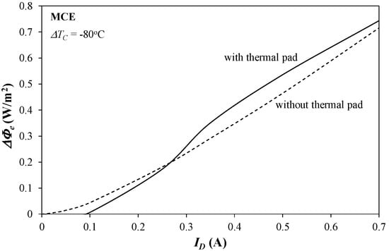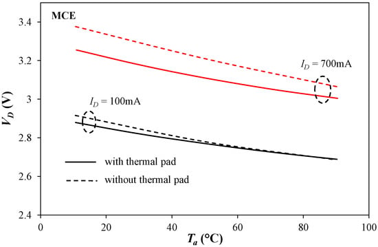 Figure 6 illustrates the dependence of the forward voltage of the MCE diode on temperature Ta at two different forward current values. As observed, an increase in temperature of the cold plate causes a decrease in the diode forward voltage. The observed dependence VD(Ta) is non-linear. The values of VD voltage obtained for the diode operating with the thermal pad are lower than for the diode operating without the pad, but the differences between these values decrease with the increase of temperature Ta and with the decrease in forward current ID.