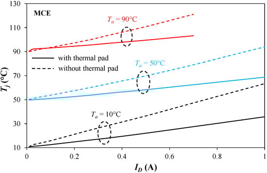 Figure 9 presents the dependence of thermal resistance of the MCE diode on the the cold plate temperature. Looking at Figure 9, it is visible that there exists a certain minimum of the thermal resistance Rth at the cold plate temperature value Ta equal to about 50 °C. It is also easy to observe that for the diode operating without the thermal pad the changes in thermal resistance are much bigger than for the diode operating with the pad.