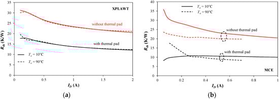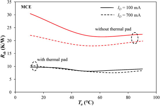 It is visible in Figure 8b that for the MCE diode a strong influence of the cold plate temperature on thermal resistance is observed. In the considered range of temperature variations, the thermal resistance can change by over 30%, and for higher Ta values, thermal resistance Rth is reduced. For the considered diode operating with the thermal pad, an increasing function describes the dependence Rth(ID) for low values of current ID. The influence of this current ID is very weak for the diode operating with the thermal pad, whereas it is very strong for the diode operating without the thermal pad.