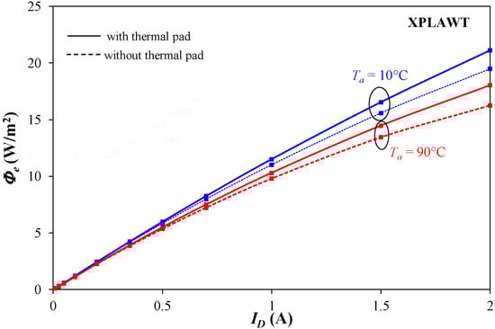 The last part of the presented experimental results illustrates the influence of the thermal pad on the optical parameters of tested power LEDs. The measured surface power density of light emitted by the XPLAWT diode presented in Figure 10 is an increasing function of the diode forward current ID. The increase of the cold plate temperature reduces the emitted light power. Moreover, it is also visible that owing to the use of the thermal pad it is possible to obtain higher values of power density. These differences become more apparent with the increased diode current and exceed even 10%.