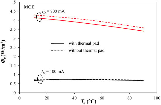 Figure 11 shows dependences of a change in the surface power density of the emitted light ΔΦe on forward current for the MCE diode. This change was measured while changing temperature of the cold plate over the range from 10 °C to 90 °C. This change is an increasing function on the diode forward current, and at ID = 0.7 A, it attains even 0.7 W/m2. The changes in the value of Φe obtained for both the considered kinds of mounting the tested power LEDs do not visibly differ between each other, and they are comparable with the measurement error.