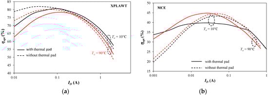 The computed dependences of the efficiency ηopt of the conversion of electrical energy into light in the tested LEDs is shown in Figure 13a for the diode XPLAWT and in Figure 13b for the diode MCE. This efficiency is equal to the quotient of the optical power Popt and the product of the diode current ID, and the diode forward voltage drop across its junction VD. The computed efficiency ηopt, in all cases has a distinct maximum. This maximum is observed at the current equal to about 30 mA for the diode without the thermal pad and around 100 mA for the diode with the thermal pad. Interestingly enough, at lower current values, a higher efficiency of conversion is observed for the diode without the thermal pad. However, within this range of currents, the power of the emitted radiation is relatively small, and junction temperature of the diode is nearly to the cold plate temperature.