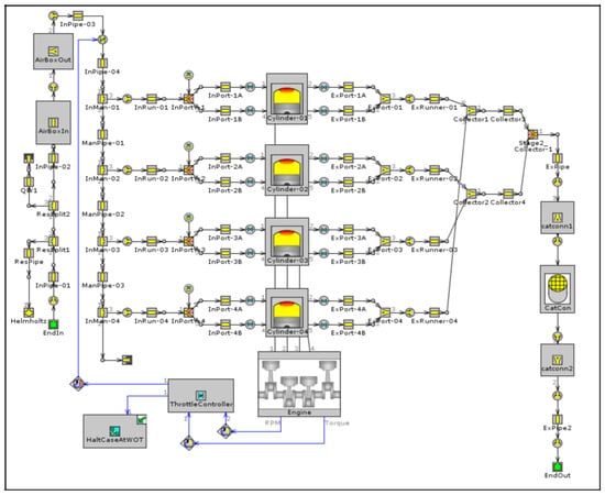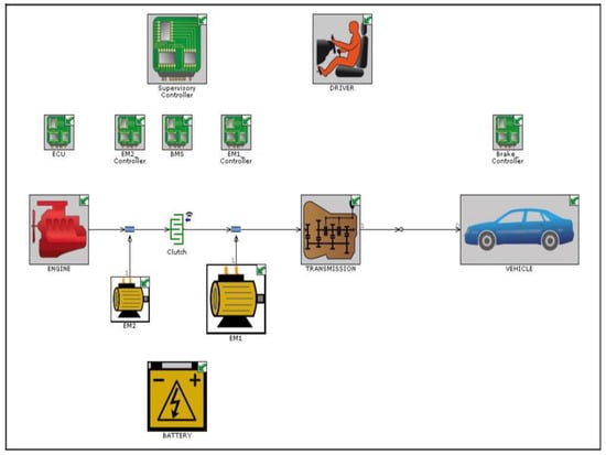 Figure 7 shows the HEV model simulated in GT-Suite. The model used was a series-parallel hybrid electric vehicle. This was to make sure it exhibited the same behaviour as the 1.8 L Toyota Prius. This model was simulated under two different drive cycles which (NEDC and WLTC). The engine specifications used in the HEV model were the same as the 4-cylinder engine model simulated in Section 3.