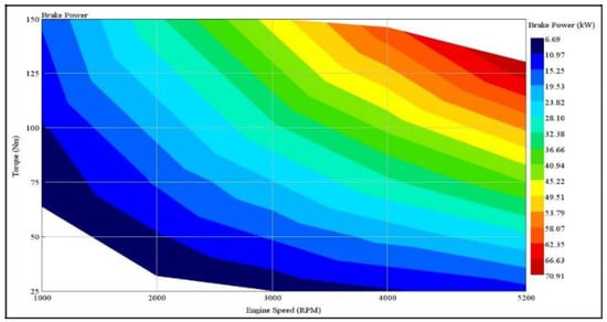 Figure 1 shows the 4-cylinder (SI) engine model used for the simulation. The validation of the engine model used for the simulation was done by comparing the Brake Specific Fuel Consumption (BSFC) value in the engine model that has a maximum power of 71 kW at the speed of 5200 RPM with the theoretical BSFC map. The theoretical BSFC map was selected from the engine specification of a 1.8 L Toyota Prius 2016 []. The data of BSFC from the 4-cylinder engine model was generated by using the throttle control connected to the engine. This control was set up to target different values of torque at different engine speeds to be in line with the operating line of the theoretical BSFC. Twenty-five different operating points ranging from 1000 RPM to 5200 RPM were used for 25 different cases to obtain the engine model BSFC map. Full specification data are provided in Table 1 and Figure 2, and corresponding BSFC and brake power data in Figure 3 and Figure 4, respectively, below.