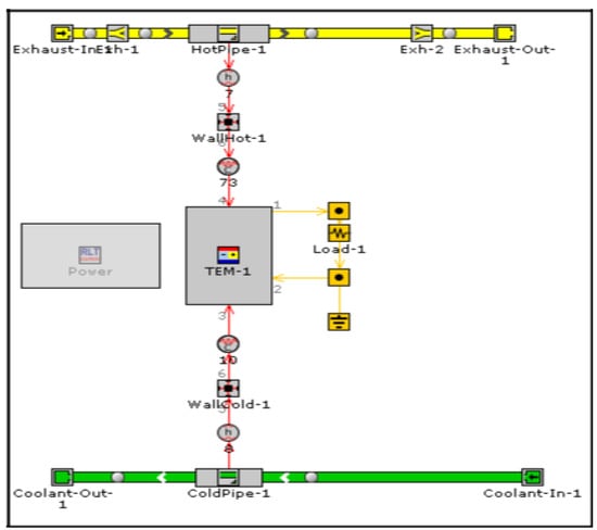 As shown in Figure 5, the TEG module was placed in between the hot pipe and cold sides of the pipe. The hot pipe refers to the exhaust pipe which shows the TEG is mounted on the exhaust of the vehicle. The cold pipe refers to the coolant temperature. The TEG module was placed in between these two pipes to create the temperature difference. The temperature difference generates voltage. The behaviour of the exhaust pipe in the TEG model used the data generated from the exhaust pipe in the engine model simulation in Section 3. The TEG was observed under 25 different cases (same as in Section 3) at the engine speed range from 1000 RPM to 5200 RPM with a torque value increment of 25 Nm, because every operating point of engine speed provides a different exhaust temperature.