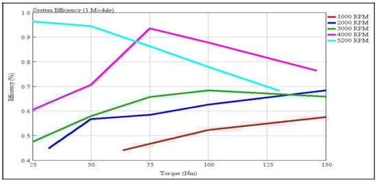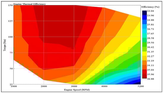 The engine model simulated showed the average efficiency of an ICE in Figure 8. The maximum efficiency of the engine was 36.88% operating at the lower engine speed with a high torque value. The engine was not very efficient at higher engine speeds. The remaining percentage of the efficiency is the waste heat that is released either to the cooling system or the exhaust.
