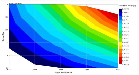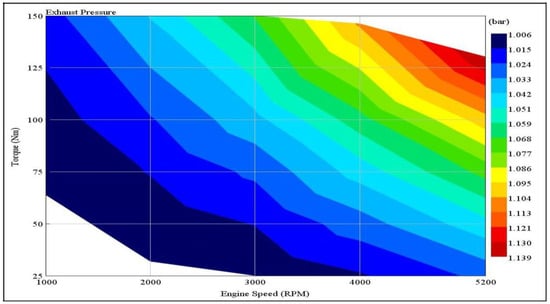 The exhaust pressure and exhaust mass flow rate increased as the engine speed and torque increase (Figure 9 and Figure 10, respectively). The mass flow rate was in the range of 0.00598 kg/s to 0.6379 kg/s and the exhaust pressure was in the range of 1.006 bar to 1.139 bar when the engine speed operates between 1000 RPM to 5200 RPM with torque range from 25 to 150 Nm.