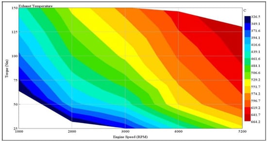 The increment in the temperature (Figure 11) of the exhaust was affected by the high pressure of the exhaust and the mass flow rate. The range of exhaust temperatures was from 326.5 ℃ to 664.2 ℃. The highest exhaust temperature occurred at the highest engine speed and torque. The TEG operates mainly based on the temperature difference. A higher temperature difference will produce more power through the TEG system. This means that the TEG system would be very efficient at a higher engine speed and torque to convert the waste heat into useful energy, as the maximum temperature difference occurs at this point.