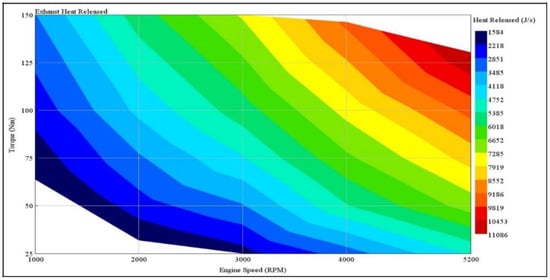 The energy released by the exhaust was calculated using Equation (5). The amount of heat energy released by the exhaust was relatively affected by the exhaust temperature and the mass flow rate of the exhaust. As seen in Figure 12, the exhaust heat released does not significantly correlate with the efficiency of the engine. The highest heat released through the exhaust was not at the lowest engine efficiency. This is because the waste heat released was also rejected through the liquid coolant, lubrication oil or charge-air heat exchangers []. Hence, the highest amount of waste heat available for TEG to recover was at the highest engine speed and torque.