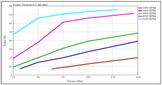 The power generated is illustrated in Figure 13 and arises due to the voltage produced across the device, known as the Seebeck effect. The module can generate a maximum power of 75 W at the highest engine speed. This is because the highest temperature difference can be achieved at the highest engine speed. A higher temperature difference will produce a bigger voltage.