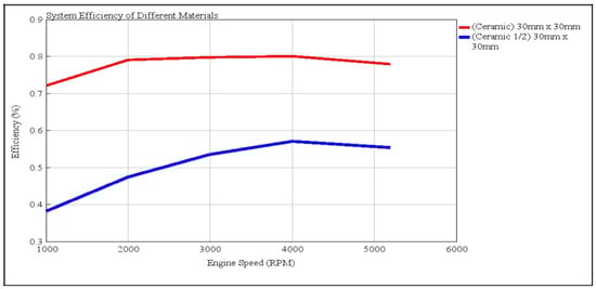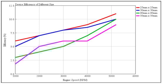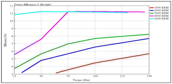 The efficiency of TEG increased as the engine speed increased due to the corresponding higher exhaust temperature and mass flow rate. Hence, the temperature difference across TEG was greater and more power is produced. Figure 25 shows that the overall system efficiency of TEG was still low even though the device efficiency already achieved a greater value. This statement is supported by [], as the overall system efficiency of TEG is less than the device efficiency due to the parasitic loss in the electric power conversion.