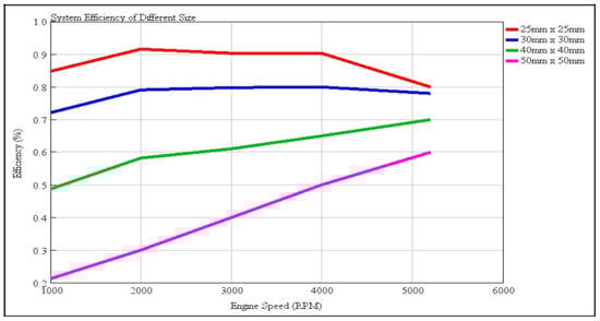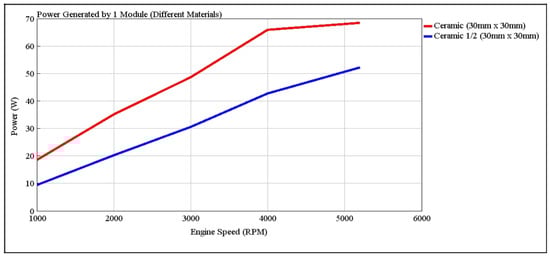 This section shows the effects of varying the parameters relevant to the TEG system operation. The work started with a single module of TEG with a size of 25 mm × 25 mm. The module was simulated at different engine speeds to study device efficiency and system efficiency of the TEG by varying the module size and materials used. The most efficient single module was selected to be added in series. Different numbers of modules were investigated.