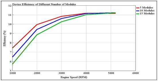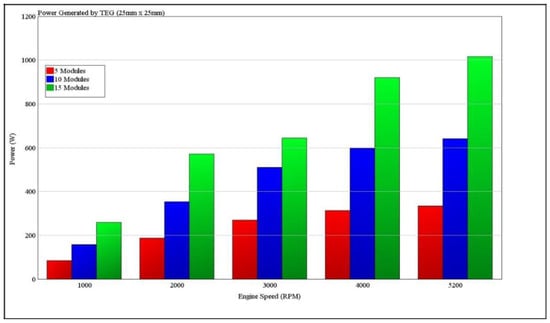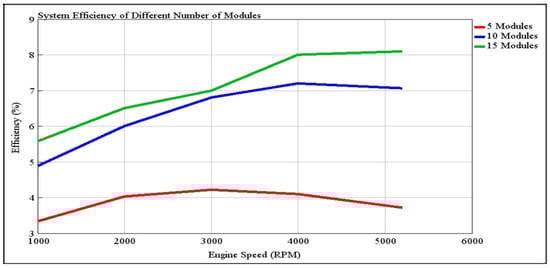 The power generated by the TEG system was increased by adding a number of modules in series (voltage of an electric circuit is added up when connected in series). However, the increase in number of modules make individual TEG efficiency lower at a lower engine speed, where the corresponding level of heat released is minimised and where the multi-module version of TEG suffers disproportionately in terms of its ability to recover waste heat. However, the maximum achievable efficiency of the device still converges to very similar values at a higher engine speed, with the increase in exhaust heat availability. Conversely, as the power levels achieved by the 10- and 15-module TEGs increased, the system efficiency also increased, as per Figure 23.