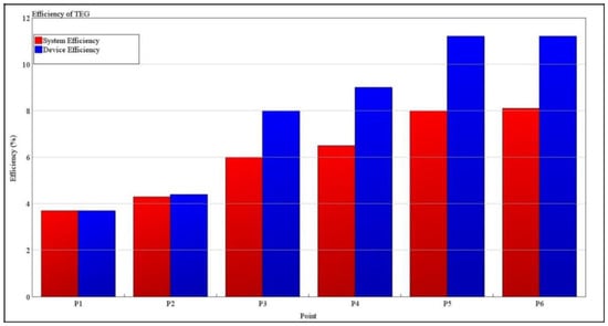 However, the average efficiency of the TEG system was 6%, which was greater than the previous efficiency of the TEG investigated. The increase in efficiency is because this TEG model can withstand a higher temperature, which makes it useful in higher temperatures. This is the most important design choice in improving the efficiency of TEG. A temperature limitation of the material makes the TEG less efficient. A high temperature thermoelectric material is in recent development by [] and the efficiency of TEG is expected to reach 20%.
