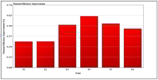 For a combined TEG system with the engine, the thermal efficiency improvement and the Brake Specific Fuel Consumption (BSFC) reduction can be calculated by using Equations (3) and (4) []. The thermal efficiency improvement is defined by the ratio of added power from the WHR when it is used back in the system divided the amount of fuel power input over a cycle or at a given engine operating condition.