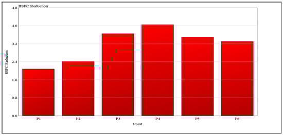BSFC reduction was observed by increasing the output power without changing the mass flow rate (Figure 26). The additional power provided by the TEG was used to increase the engine output power. Equation (4) in Section 2.3 explains this mathematically. Figure 27 shows the reduction of BSFC as a result of TEG operation. The reduction increased as the engine speed increased up to a mid-level peak, then started to decline beyond 3000 RPM. This is because the thermal efficiency improvement of the engine offered by TEG at higher engine speeds is low. TEG is not as efficient in improving the engine efficiency at higher engine speeds as it is in the mid-speed range.