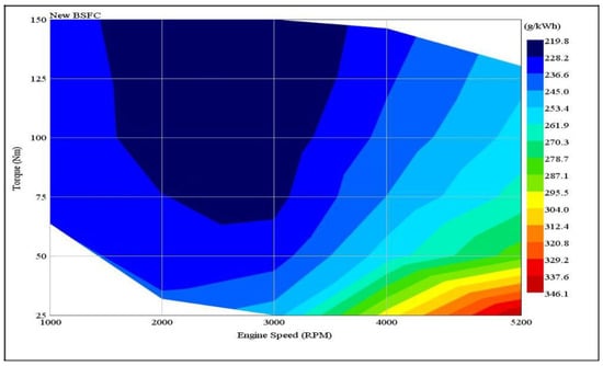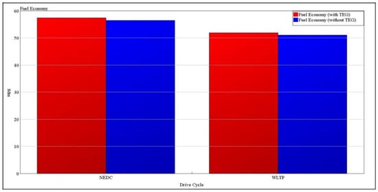 The values of fuel economy from the test data and simulation were slightly different but the HEV model simulation was mainly performed to observe the fuel consumption improvement after improving the engine efficiency. No further modification was done on the HEV model. The new BSFC was calculated using Equation (4) and the HEV model was simulated again after the engine efficiency improvement done by TEG, as described in Section 3.