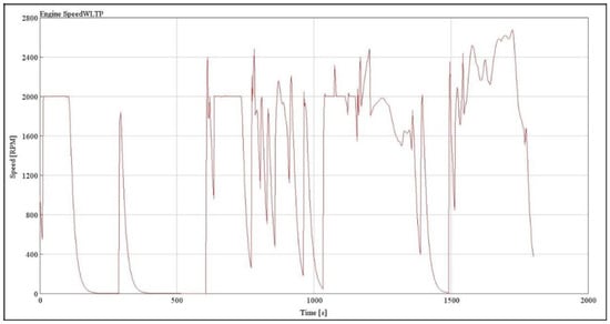 Same as for the NEDC drive cycle, the engine for the WLTP drive cycle in this simulation was also run at a low speeds while operating at slightly higher vehicle speeds in a more dynamic fashion compared to the old NEDC (Figure 30 for vehicle speed and Figure 31 for engine speed, respectively). The low engine speed caused lower exhaust temperatures, resulting in a lower efficiency of TEG.