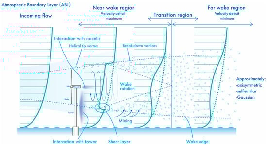 Figure 1, with the rotation of the blade of the wind-turbine, a region of wind-velocity deficit with temporal and spatial variations is formed downstream of the wind-turbine. This flow phenomenon is called wind-turbine wake. Wind-turbines in offshore wind farms operating in downwind wake flow are subjected to two main problems. One is decreased energy production due to the wind-velocity deficit, and the other is increased fatigue loading due to the added turbulence intensity generated by the upwind turbine. The mutual interference of wind-turbine wake, which is a strongly nonlinear flow phenomenon, occurs especially in large offshore wind farms consisting of multiple wind-turbine groups. The mutual interference of wind-turbine wakes is an essential and inherent problem in offshore wind farms. Therefore, in order to improve the power efficiency and lifetime of a wind-turbine, an accurate understanding of wake effects due to the mutual interaction between the wakes of the wind-turbines is extremely important [