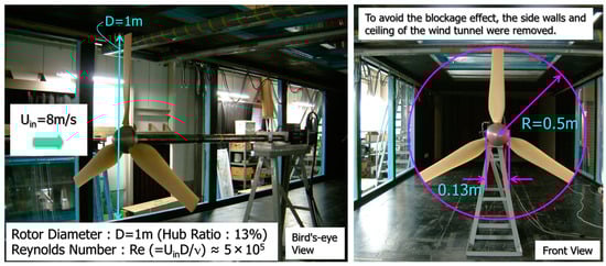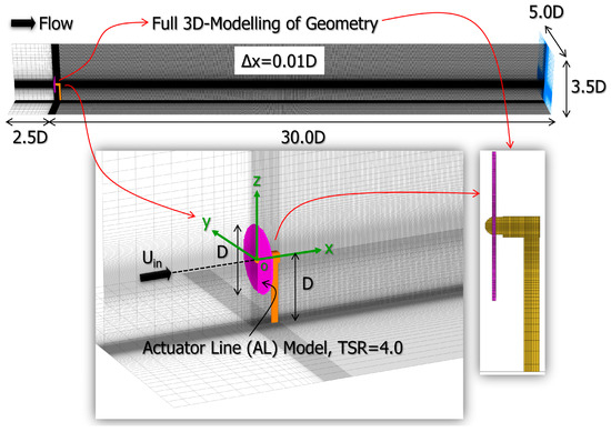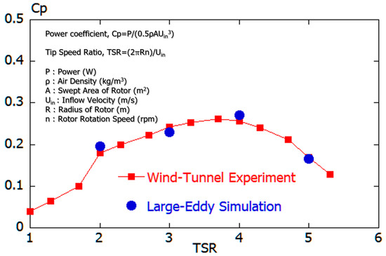 Section 2, the wind-turbine blades were rotated at the optimal TSR = 4.0, at which the power coefficient Cp showed the maximum value. In order to reproduce the shape of the nacelle and tower, the spatial grid resolution in the vicinity of the wind-turbine was set to Δx = Δy = Δz = 0.005 D (x+ = y+ = z+ < 10.0). Here, D is the diameter of the wind-turbine blade. In order to eliminate the influence of the spatial-grid resolution on the reproduction accuracy of the wind-turbine wake as much as possible, the spatial-grid resolutions in the x direction were all the same downstream of the wind-turbine, and Δx = 0.01 D. The total number of grid points in the entire computational domain was about 85 million (3075 (x) × 171 (y) × 161 (z)). In particular, we focused on reproducing the generation and collapse of tip vortex, and set the spatial resolution in the streamwise direction (see
