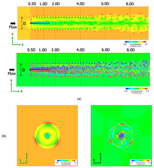 Figure 17c, an almost concentric wake region was formed behind the wind-turbine in the near-wake region with x = 5.0 D. In the far-wake region of x ≥ 10.0 D, the concentric wake region was greatly deformed with the occurrence of the vertical meandering motion. In the visualization result (
