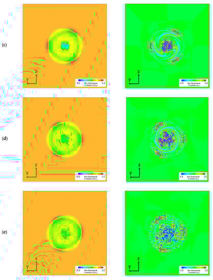 Figure 15a, a waveform that reflected the behavior of the tip vortex that was periodically formed and shed was clearly observed, as described above. On the other hand, at x = 30.0 D in the far-wake region shown in