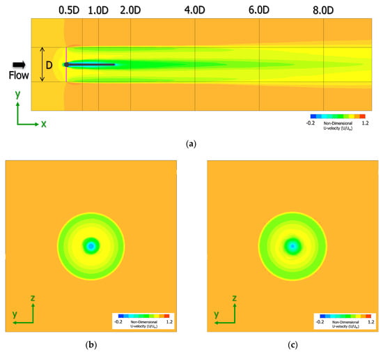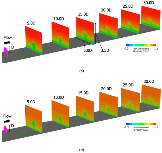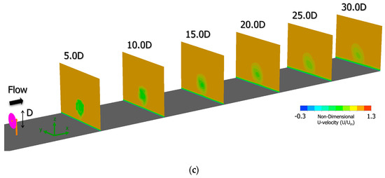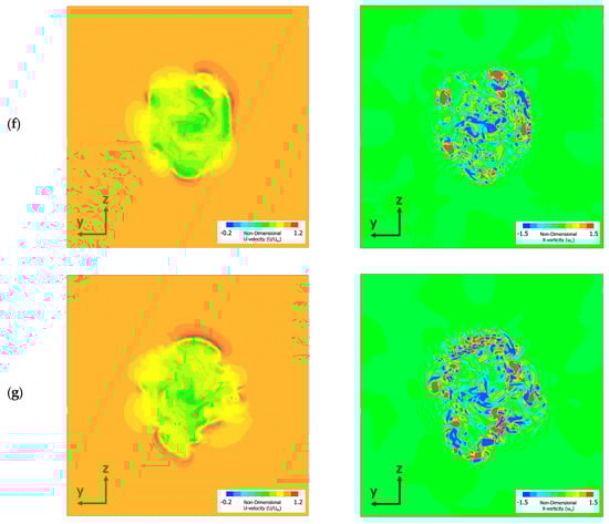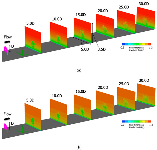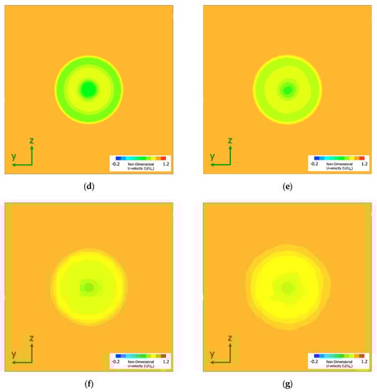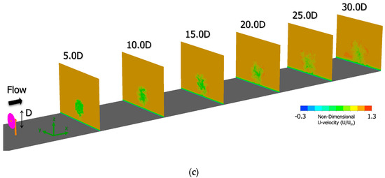 Figure 17 shows the spatial distribution of U-velocity in the y–z plane (front view) at x = 5.0 D to 30.0 D for the instantaneous flow field of t = 400 R/U