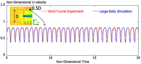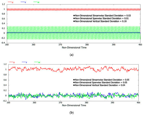 Figure 15 shows the time variation of the three velocity components at the N = 4 measurement points (x = 0.5 D and z = 0.5 D, x = 30.0 D and z = 0.5 D) shown in