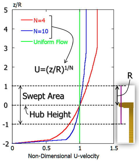 Figure 13, various inflow shears were assumed at the inflow boundary surface, and we conducted wind-turbine wake simulations installed on a flat terrain. On the basis of the obtained results, the effect of inflow shear on the flow characteristics in the wind-turbine wake region was considered. Similar to the calculation shown in