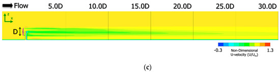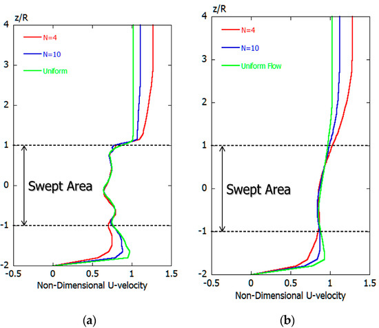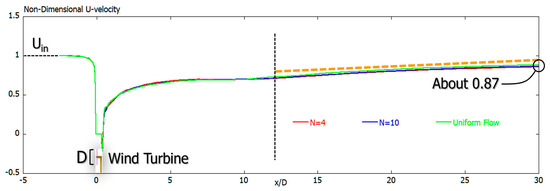 Figure 20b, an approximately conical wake profile was formed in all cases of N = 4, N = 10, and uniform flow. We arranged the vertical distribution of time-averaged U-velocity for every three cases of N = 4, N = 10, and uniform flow. The results are shown in