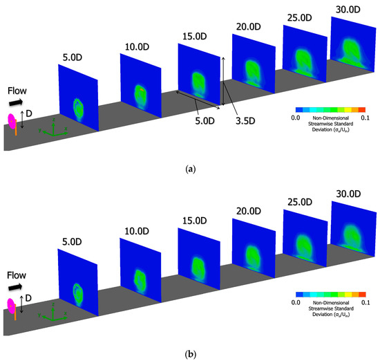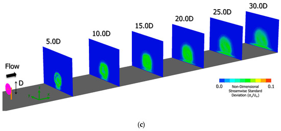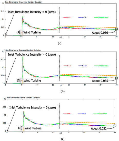 Figure 23, the slope at which the nondimensional standard deviation decayed changed in the far-wake region of x ≥ 12.0 D. As shown in the figure, the numerical value at x = 30.0 D in the far-wake region gradually decreased in the order of the (a) streamwise, (b) spanwise, and (c) vertical directions. There are some points to note here. As shown in