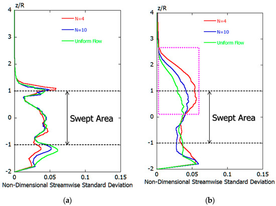 Figure 21a, almost the same numerical values were shown in the entire swept area of the wind-turbine, regardless of the difference in speed shear. At the top position of the wind-turbine blade, z/R = 1, and at the bottom position of the wind-turbine blade, z/R = −1, maximal values are clearly shown. The maxima at these two locations are due to the passage of the periodically formed tip vortex. On the other hand, the differences within the swept area for different values of shear are significant at x = 30.0 D (see dotted line in