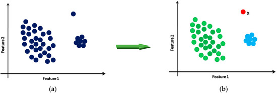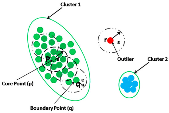 Since an outlier deviates substantially from other data points, it will not belong to any of the clusters and will be left out as an isolated point and can thus be detected (point x in Figure 3b). Clustering approaches can be broadly classified into partitioned, hierarchical, density-based, grid-based and model-based ones [21]. The present work exploits the capabilities of DBSCAN, a density-based clustering approach, to automatically detect the outliers from the given dataset. As mentioned in Section 1, the said algorithm is effective and widely used in different applications when the distribution of the feature values is not known a priori, and it is simple too. The algorithm uses two parameters: ε and minpts. The significance of these parameters is mentioned in the following section. At the termination of the algorithm, the data points, which do not belong to any of the clusters, will be treated as outliers. The working principle of the algorithm is given below in more detail.
