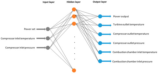 The ANN model structure with input and output parameters is shown in Figure 6. A previous work of the authors [16] showed the power set, compressor inlet temperature and pressure as the optimum inputs to predict the performance of the engine with high accuracy. The outputs are the power output and the performance parameters at different parts of the engine. The multilayer perceptron (MLP) (an ANN) with one hidden layer was used and trained with the back-propagation algorithm. The commercial software NeuralSolutions (ver. 07, NeuroDimension, FL, USA) was employed for network training.