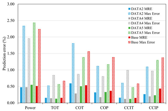 The comparison between the prediction accuracy of the three best ANN models developed by automatically filtered datasets—namely, DATA2, DATA4 and DATA5—and the baseline ANN developed by a manually filtered dataset for all output parameters is demonstrated in Figure 7. Figure 7 shows the mean relative error (MRE) together with the maximum error (i.e., worst case) for each output parameter of the ANN models. For each ANN model, the solid-filled columns represent the MRE value, and columns filled with downward diagonal patterns indicate the maximum errors. Comparing to the baseline ANN, we can see from the figure that three ANNs not only predict the performance parameters of the engine with almost the same accuracy but, also, have the potential for further improvement of the errors. Of these three ANNs, the ANN developed based on DATA4, which corresponds to the filtered dataset with 468 detected outliers, has provided the highest accuracy with a minimum average error for all outputs (i.e., 0.22 compared to 0.36 for the baseline model). Except for the turbine outlet temperature and combustion chamber inlet temperature, for which the maximum errors are slightly higher than those of other ANNs are but, still, markedly below 1%, the maximum errors of the other four parameters are the lowest, compared to other ANNs and the baseline model.