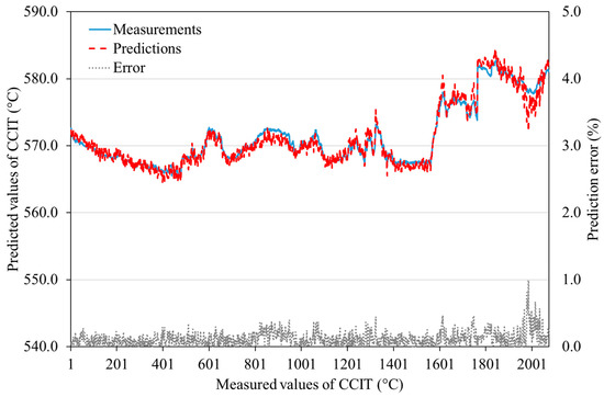 For visualization of the prediction accuracy, Figure 8 and Figure 9 show the comparison between the measured and predicted values for two engine parameters—namely, power output and combustion chamber inlet temperature, respectively. The error values are represented by dotted lines on the secondary y-axis. These figures demonstrate that the ANN model constructed by the proposed automated filtering method can predict the engine parameters with a very high accuracy, perfectly following variations resulted by changes in the operational conditions. The prediction error for the power output for most samples is below 1%, and the maximum error (i.e., worst case) does not exceed 2%, which is higher for a few samples in the baseline model (refer to Table 3).