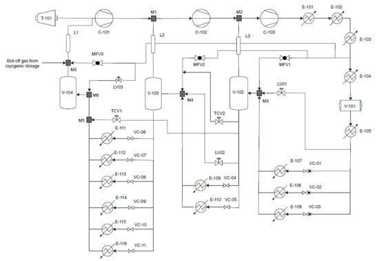 The suction lines of the ethylene compressor (L1, L2, and L3) were included in the evaluation because they have a relevant pressure loss by design, which may affect cycle performance. Because they are isolated cryogenic lines, they were considered adiabatic, and therefore, the applicable equations are identical to the equations shown for the control valves.