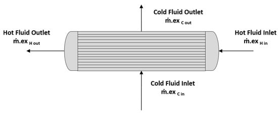 Heat exchangers are devices that allow the transfer of heat between a cold stream (which will be heated or evaporated) and a hot stream (which will be cooled or condensed). The cycle exchangers are typically shell and tube type and the heat exchanged depends on the temperature difference between the incoming and outcoming streams. Figure 2 shows the exergy balance of a heat exchanger.