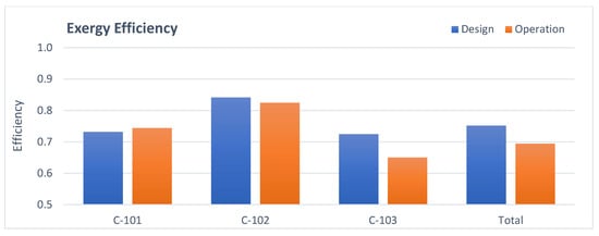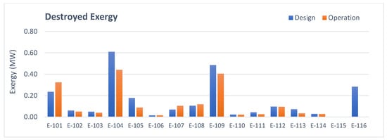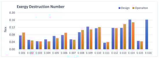 E-101 cools the ethylene coming out of the compressor discharge using cooling water, and due to the large temperature difference between the cold and hot sides, this is the exchanger with the lowest exergy efficiency. It is also the exchanger with the worst performance in the operation case compared to the design case, with 30% more exergy destroyed and 5% lower efficiency. The poor performance is mainly due to the higher discharge temperature of the third compressor stage (C-103). The greater the temperature difference between the cold and hot streams, the greater the generation of entropy in a heat exchanger.