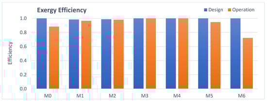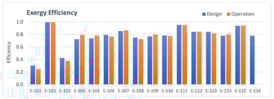 In general, most exchangers exhibit satisfactory performance in both evaluated cases, with exergy efficiencies close to 80%. Exchangers E-101 and E-103 have the lowest efficiency in the cycle. The efficiency of E-102 was calculated using the classical efficiency calculation approach, and therefore, higher values were observed compared to the other exchangers for both evaluated scenarios.