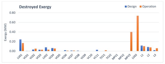 The largest portion of exergy destruction in the valves and lines (approximately 65%) occurs because of the operation of the mini-flow valves (MFV3) and the first stage level control valve (LV03) in the operation case.